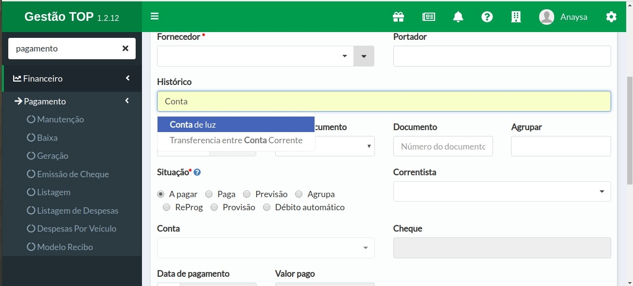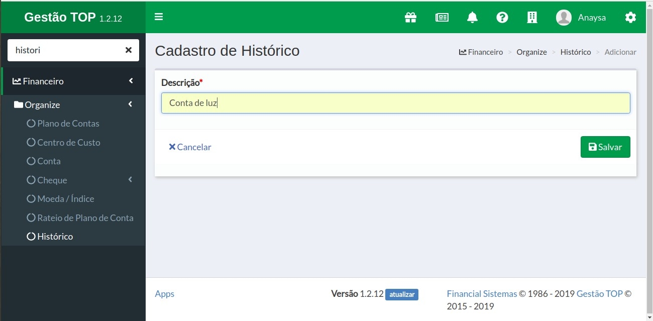 - No menu vá em Financeiro > Organize > Histórico